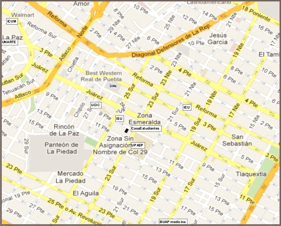 Estamos muy bien ubicados dentro de la Ciudad de Puebla, a una cuadra de la Zona Esmeralda donde cuentas con todos los servicios necesarios para tus estudios.